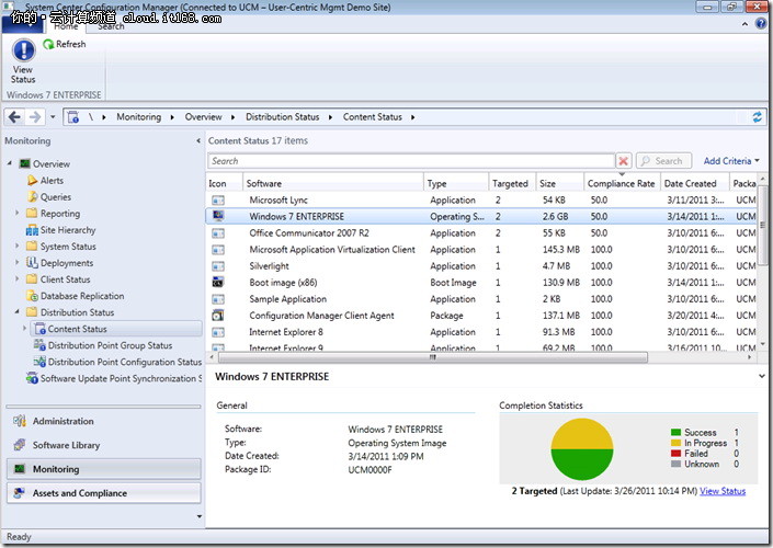 (下图所示:内容分发到了两个分发点。第一个图是内容状态节点,让我们可以快速查看我们环境中的所有内容。第二个图详细显示了Windows 7 Enterprise分发,所以我们能够获得更清楚的视图当前状态。)