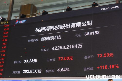 1月20日,国内领先的云计算服务商优刻得科技股份有限公司(股票简称:优刻得,股票代码:688158)正式在上交所科创板挂牌上市,成为中国云计算第一股,中国A股市场卓越家同股不同权的上市公司。开市后,开盘价达到了72元,涨幅119.68%。