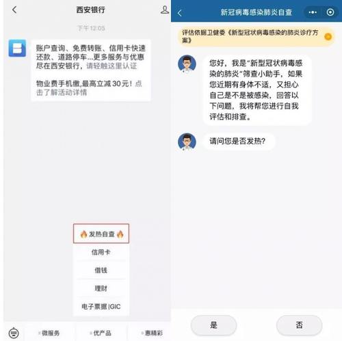 此外,疫情期间,为了方便银行用户获取疫情动态及防控工作讯息,西安银行还将公众号与腾讯健康小程序完成对接,公众号用户点击工具栏中的“发热自查”即可进入腾讯健康小程序,获取新冠肺炎自主诊断工具,包括发热门诊查询、免费义诊、确诊患者行程查询、专家辟谣平台等。