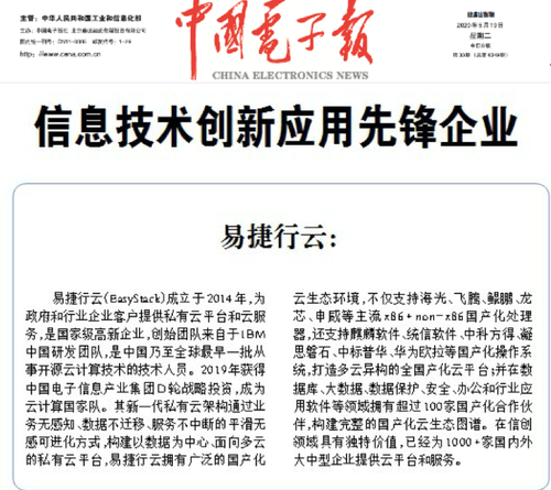 近日,由中国电子报主办、工信部相关领导及行业专家共同参与评审的“信息技术创新应用先锋企业”在中国电子报进行了展示。易捷行云(EasyStack)获评“信息技术创新应用先锋企业”。