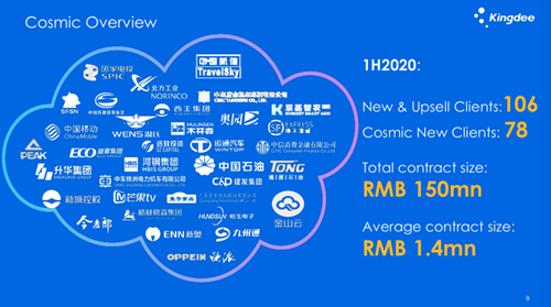 与此同时,以金蝶云·星空为核心平台的中小企业市场,业绩表现也非常出色。金蝶云•星空收入达5.01亿元,同比增长30.4%,客户续费率87%。认证客户数量已累计1.57万家,新签客户包括华为海洋、旷视科技、盐津铺子、科大讯飞、黄河科技等。同时,集团持续推动渠道伙伴云业务转型,促进伙伴老客户升级。2020年上半年,金蝶云•星空伙伴数量近1000家。另外,星空云已入选全国 17 大省区 26座城市政府发文推荐厂商目录,是工信部认证「百万企业上云行动战略合作伙伴」,并获亚马逊 AWS 认证为 2019 年度唯一非常好的 SaaS 合作伙伴。