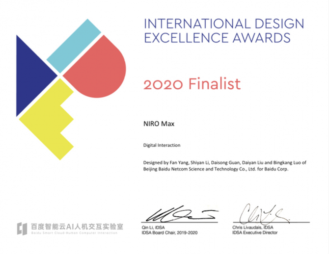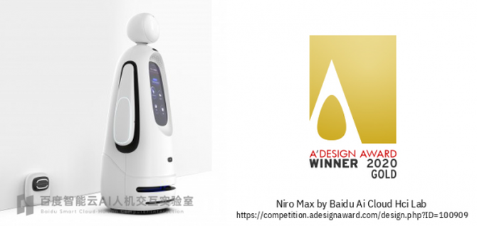 百度智能云在硬件设计和研发上的能力获得国际权威赛事的认可。在2020年 6月,百度NIRO Max机器人、人脸抓拍桶机、NIRO Key和NIRO Hi等多款智能硬件产品一同荣获了意大利A’Design Award产品设计奖。其中,NIRO Max一举成为今年全球范围内唯一获得A’Design Award金奖的服务机器人。在2020年 9月,NIRO Max机器人从全球上万的参奖作品中脱引而出,获得了美国IDEA工业设计奖。