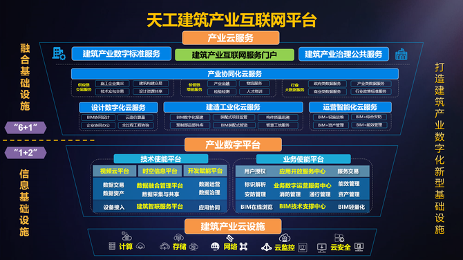 天工建筑产业互联网平台的底层包括计算、存储、网络、云监控、云安全等基础设施,往上是包括视频云平台、时空信息平台、开发赋能平台、数据融合管理平台等技术使能平台,以及应用开放中心、业务数字运营服务中心等业务使能平台,主要秉承的是“1+2”原则,打造覆盖建筑行业全生命周期的技术平台能力。在往上,是“6+1”融合基础设施,上面包含6大类产品服务,涉及产业协同、产业治理、设计、云化建造、运营云化等等。整体来看,整个平台分几个重要维度,一个是企业信息化维度,另一个是产业园区维度,第三个是面向的是智慧城市服务。不同的利用空间,服务的场景不同,总体目标是通过打通底层数据,建立新应用体系和新标准,实现智慧城市或者是新建造的转型升级。