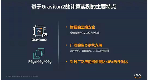 2021年1月28日,亚马逊云服务(AWS)正式宣布,由 AWS Graviton2 处理器提供支持的 Amazon Elastic Compute Cloud (Amazon EC2 M6g、C6g 和 R6g 实例已在由光环新网运营的 AWS 中国(北京)地区和由西云数据运营的 AWS 中国(宁夏)区域推出,这是AWS自研的、原生为云而设计开发的芯片,也是AWS自研处理器首次落地中国区域。Graviton 2作为AWS的第二代基于Arm架构的处理器,基于 64位Arm Neoverse N1微架构设计,这是ARM第一款数据中心定位的CPU架构。与同配置X86实例相比,Amazon EC2 M6g、C6g 和 R6g 实例的性价比提高了40%。