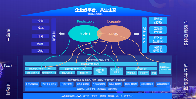 刘翔认为,更偏向流程的应用即是稳态,主要和企业内部经营管理相关;而更偏向员工、客户和伙伴这端,则是敏态,更侧重场景化的应用。为了让稳态和敏态形成闭环,让用户拥有一致性体验,整个平台在底层的IaaS以及IaaS+这层通过云原生架构实现了云上、云下的互通;而在整个平台最核心的PaaS层,会有所区分,比如:更偏稳态的开发会聚焦在PC端,通过PC建模平台实现,而更偏敏态的开发则聚焦移动端,配合超级APP提供移动应用建模平台,最终实现两态业务的互通则通过BPM流程平台、iPaaS全域集成平台实现混合云层面的业务互通。