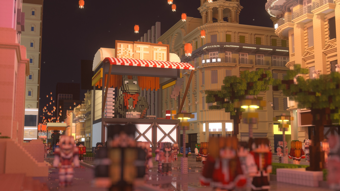 大型建筑质感考究,小物件也丝毫没有降低要求,为了充分展示江汉路步行街的夜景之美,玩家们将全部元素进行大比例制作:原本一个1X1的方块即可呈现的“简版”灯笼,现在需要40-50个方块来搭建,渲染计算量以数十倍增长。但有联想算力助阵,充满质感的步行街夜景经得起无限放大,每一个细节都蕴含匠心和技术实力。