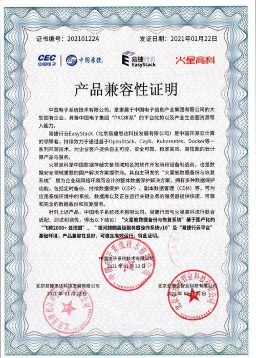 在多方利好政策的支持下,我国信创产业的创新能力将进一步提升,到2030年有望释放万亿级市场规模。近期,易捷行云EasyStack与中国系统、火星高科完成三方兼容性测试,经过联合适配、测试和调优,易捷行云新一代私有云ECS基于飞腾2000+处理器与银河麒麟高级服务器操作系统V10,与火星舱数据备份与恢复系统V6.0产品兼容性良好,可稳定高效运行。