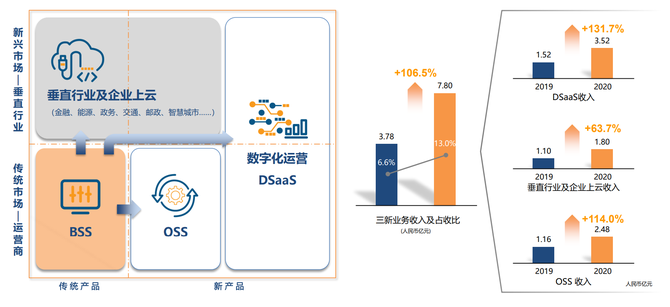 面向未来,公司将积极拥抱5G、云计算、大数据、人工智能、物联网等先进技术手段,坚定不移地推进战略转型,高质量筑牢“一巩固”,高速度推进“三发展”。传统业务方面,将继续巩固运营商市场领导地位,积极业务挖潜,持续提升效能,在“三新”业务方面,将加速规模化扩张,其中DSaaS业务规模与模式创新并重,垂直行业企业上云业务聚焦行业、高质发展,OSS业务存量和增量齐头并进、提升市场份额。公司将与业界伙伴共同建设开放合作的生态体系,持续推动商业模式变革,加速跟进国家“新基建”、“信创”、“新型智慧城市”的建设步伐,致力成为5G时代大型企业数字化转型的使能者。