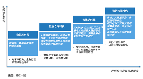 将大数据应用场景映射到技术、产品层面,在过去十年的数字化浪潮中,大数据技术已经经历了几次更新升级。从专注存储的数据库,到面向统计分析的数据仓库,再到面向大数据分析应用场景的Hadoop/Spark为核心的大数据平台,都在不断的提升数据分析利用能力。当然,随着企业内不同架构的数据管理分析系统的建设,也加重了数据烟囱的问题,增加了数据管理工作的复杂性和难度。
