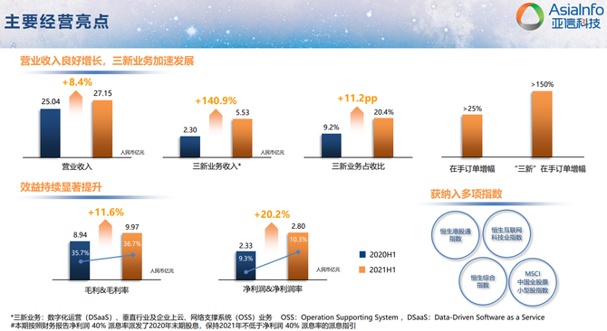 “三新”业务(DSaaS业务、垂直行业及企业上云业务、OSS业务)的规模化扩张加速,是公司总体经营业绩保持良好增长态势的重要驱动力。上半年,“三新”业务收入大幅增长至约人民币5.53亿元,增幅140.9%;占总收入比重首次超越20%,在手订单同比增长超过150%。