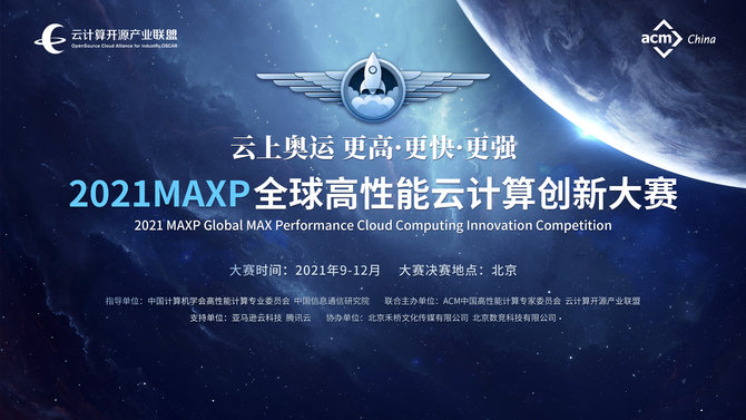 由中国计算机学会高性能计算专业委员会和中国信息通信研究院(以下简称中国信通院)指导, ACM中国高性能计算专家委员会(ACMSIGHPC)和云计算开源产业联盟联合主办,亚马逊云科技和腾讯云支持,阿里云、华为云、UCloud、天翼云等厂商参与的2021全球高性能云计算创新大赛(以下简称2021 MAXP大赛)于今日上午在中国信息通信研究院隆重开幕!