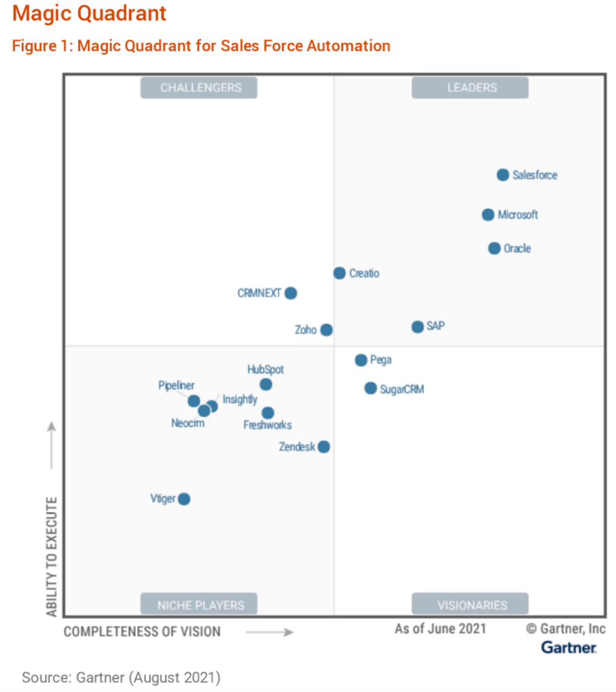 Gartner 2021年最新的销售自动化SFA魔力象限报告收录了16家供应商,从数量上来看比去年收录的15家多了一家,整体上有进有出。Gartner指出,SFA市场正在强劲发展提升能力,进一步实现核心销售流程的自动化,所评估的所有16家厂商都拥有某种程度的活动情报自动化,比如电子邮件捕获,以及通过其他通信媒介捕获互动。