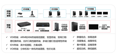 新华三终端产品家族包含三大系列十余款产品,覆盖金融、教育、医疗、企业等不同行业场景,并具备四大优势,一是胖瘦结合、按需选择;二是深度集成,故障率低;三是集中管理,运维简单;四是超低功耗,降低能耗。从产品类别来看,VDI终端包含C113系列和C101系列,可提供ARM和x86终端高低搭配、双显终端、双网口物理切换终端、光纤口高性能终端、多端口窗口型适用性终端等;IDV终端可高中低搭配,方案成熟;VOI终端可分体机和一体机终端混搭,性价比高。