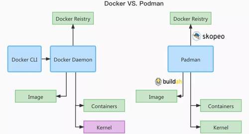 Docker使用守护进程,一个正在后台运行的程序,来创建镜像和运行容器。Podman是无守护进程的架构,这意味着它可以在启动容器的用户下运行容器。Docker有一个由守护进程引导的客户端——服务器逻辑架构;但Podman不需要此类守护进程。