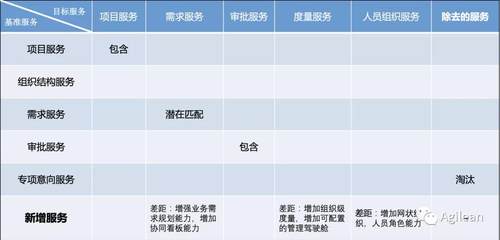 上图展示基准服务和目标服务之间的差距分析,可制定出组织居于数字化管理能力建设的路线。如增强业务需求规划能力,以补齐现有需求服务的产品规划能力弱的问题;通过增加协同看板能力以补齐价值交付协同的问题。
