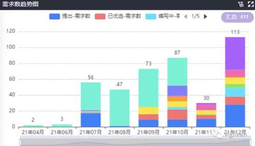这种统计报表,可以根据管理者的需要随时配置,实时生效,不再需要提需求进行开发上线。如需要观察一个产品的需求规划情况,可使用轴分类视图,数据源选择业务需求,横轴为规划月份,纵轴为需求数量,我们就能够得到这个产品需求按月份规划情况: