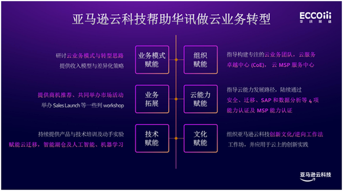 “过去,我们交付的是硬件,是看得见、摸得着的服务;与亚马逊云科技合作后,我们要去学习、了解那些靠想象才能理解的服务内容。” 朱晓勇坦言,亚马逊云科技为华讯网络带来了业务模式上的创新,拓宽了业务服务范围。比如:借助云迁移、智能数据湖等等技术服务,使得华讯网络的业务服务场景更丰富、更精深。为了建立更全面的服务体系,华讯网络还专门成立了云业务团队、云服务卓越中心、云MSP服务中心等等。
