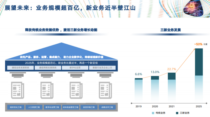 三新业务表现强劲,源自技术的持续创新和研发能力的不断投入。过去一年里,亚信科技投入研发的费用为10.06亿元,占收入总比的14.6%。秉承“中台产品体系+ 应用产品系列+行业解决方案”研发策略,亚信科技在网络和数智化领域双领先,也为“三新”业务的快速发展注入新动能。