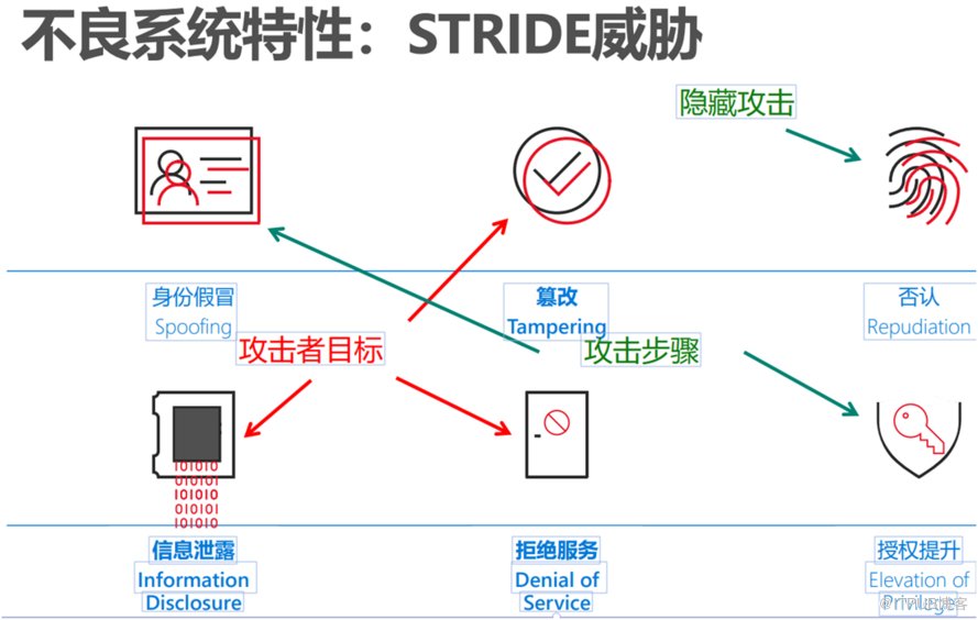 事实上,上述这些问题都可以根据STRIDE威胁模型进行分析。所谓STRIDE ,其实是全生命周期安全问题管理的组合。S,是Spoofing,指身份假冒;T,是Tampering,即篡改信息数据;R,指Repudiation,即否认,把自己的痕迹擦干净,表明自己没有来过;I,指Information Disclosure信息泄露;D,是Denial of Service,即拒绝服务,我们经常听到的DDoS攻击(分布式拒绝服务攻击)就是其中一个变种;E,是很可怕的Elevation of Privilege授权提升,比如一个账号刚进来的时候没有太多特权,于是他想升级,因为在他打开你的保险箱拿东西的时候需要一个钥匙,他必须升级后,获得管理员权限,拿到很多钥匙。这时,很多的信息、安全资产会面临威胁。