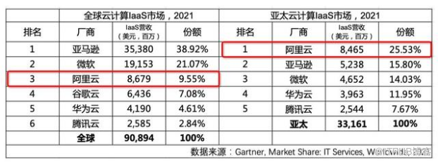 行业权威研究机构Gartner发布2021年全球云计算IaaS市场份额。数据显示,阿里云排名全球第三,市场份额为9.55%,连续6年实现份额增长;同时,阿里云排名亚太市场第一,市场份额为25.53%。