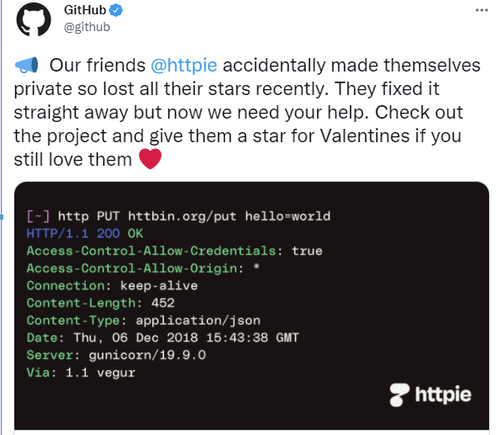 然而,就在 HTTPie 发展一切顺利、即将迎来在 GitHub 上托管十周年之际,Jakub Roztočil 的一个误操,令 HTTPie 这十年积攒的所有 Star 都凭空消失了。