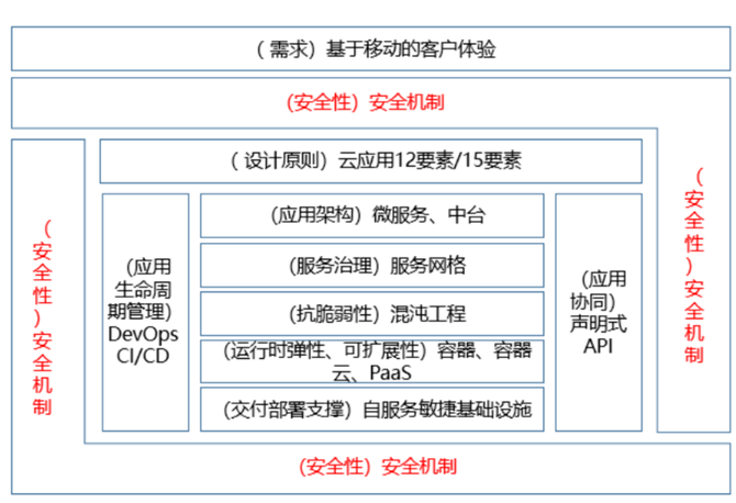 十二个要素应用为云原生应用的设计提供了原则指导;微服务架构为云原生应用架构设计、分布式部署、敏捷变更等提供了方案;容器则为云原生应用提供了弹性伸缩、一致性环境等能力,和微服务结合,支撑应用随需扩展;自服务敏捷基础设施则提供了云原生应用持续交付的基础设施资源等保障,可以和容器化PaaS平台共同支撑云原生应用的自动化弹性扩展、可视化监控、自动化智能化运维运营等,使用户无需关注基础设施资源,无需运维基础设施资源,无需关注应用部署位置等;服务网格支撑着服务的管理和治理;混沌工程则持续增强系统的韧性和稳定性;DevOps优化组织间的协同,满足彼此的关切,指导C ICD的落地和持续交付,实现应用全生命周期管理;声明式 A PI则实现了服务标准化发布和服务之间的协同;安全则涉及云原生架构体系的方方面面,比如 D evOps安全 D evSecOps、容器镜像安全、网络安全、应用安全、 A PI安全、认证授权、访问控制等等;所有这些技术和方法、原则满足客户随时随地随需的需求,简化客户操作,提升客户体验。