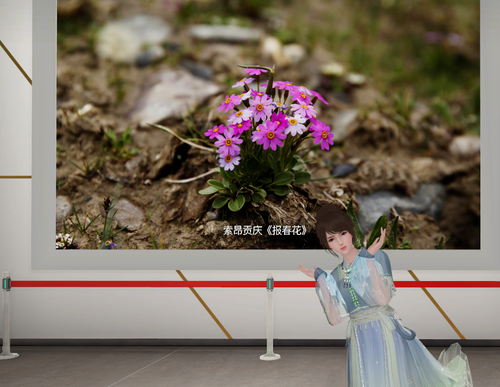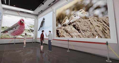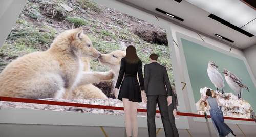 入场后,观众自由操纵虚拟分身,漫步在摄影展厅内,驻足于感兴趣的摄影作品前。还能随心切换观看视角,沉浸式欣赏野生动植物影像,随时与喜爱的作品合照。