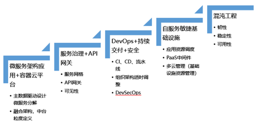 根据云原生架构体系中技术之间的关系和实际经验,基于“顶层规划+分步实施”的原则,云原生架构实施路线图我们定义为5个步骤: