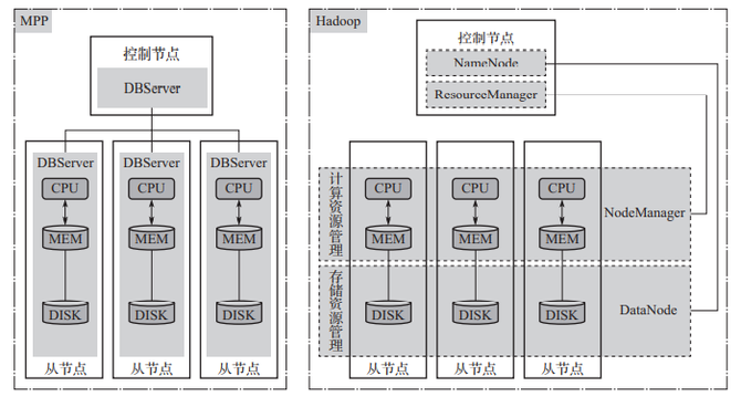 两类系统运行的硬件架构是相同的,都是普通服务器组成的集群,但从资源管理角度来说,它们并行化软件实现的设计思路却是相反的。