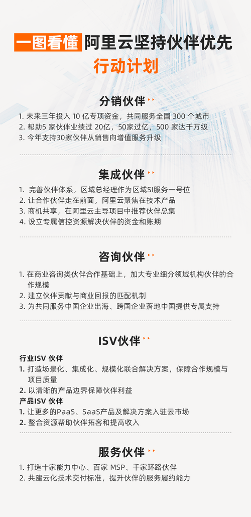 根据各类伙伴的专长与合作模式,阿里云量身定制了一揽子权益体系,主要有:未来三年投入10亿专项资金,与分销伙伴共同服务全国300个城市;在阿里云主导项目中推荐集成伙伴总集;加大专业细分领域机构伙伴的合作规模,并为咨询伙伴服务中国企业出海、跨国企业落地中国提供专属支持;以清晰的产品边界保障ISV伙伴利益,整合资源帮助其拓客和增收;共建云化技术交付标准,提升服务伙伴的履约能力。