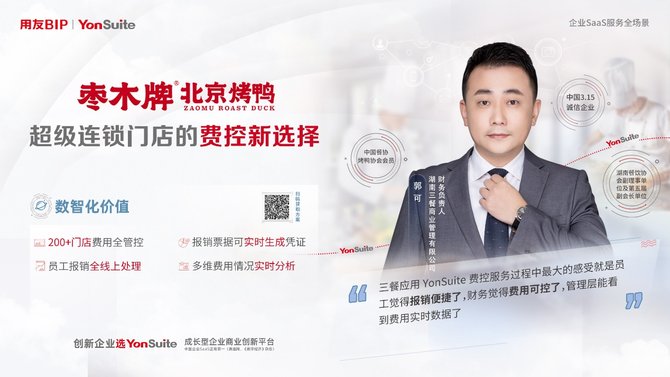 以费控业务场景为例,三餐集团携手用友YonSuite,从集团财务和费控管理着手,开启了企业数智化转型历程。在项目第一阶段,双方通过构建多组织财务管理统一平台,将企业外部商旅、餐饮、公务、出行、门店等数据链接进来,通过YonSuite费控服务流程数据流传,与企业内财务、税务等一体化融合,实现端到端的费控管理能力。三餐集团借助YonSuite费用管控,让员工的报销便捷了,财务的费用可控了,让管理层能看到费用实时数据了。管理上,企业既实现了业财融合,也做到了流程规范控制。数据驱动下的数智化管理平台为企业高增长提供强劲动力!