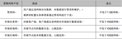 为了保证云存储的性能以及安全性,通常规划云平台的分布式存储集群在逻辑上分为三个网络平面:存储业务网络(存储外网)、存储前端网络(存储内网)、存储后端网络(存储内网)。存储的前端网络和后端网络为了保证性能,建议分开,但是在网口资源有限的情况下,也可以将前端和后端网络合并,但业务网与存储内部交换网络是需要分开的。