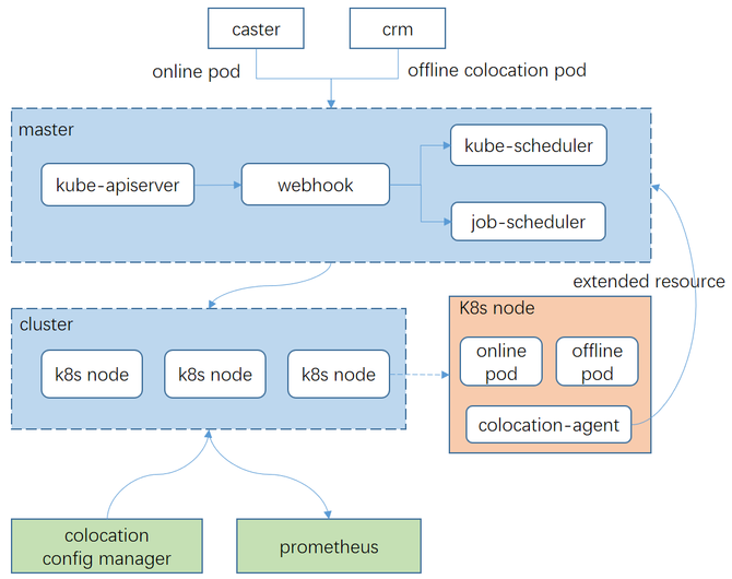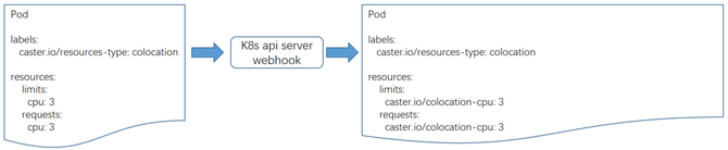 2. 混部任务在申请资源配额时,仍然申请原生cpu资源,但是会增加pod标签“caster.io/resource-type: colocation”。k8s webhook模块根据标签识别到混部pod,然后将pod申请的资源修改为混部扩展资源。这种方式对业务层屏蔽了底层扩展资源,通过标注pod标签即可指定是否使用混部资源。