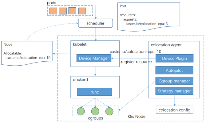 1. colocation agent模块中,策略组件会实时加载当前接收到的混部配置,并调用autopilot组件进行混部算力的计算,然后通过device-plugin组件上报混部扩展资源,例如caster.io/colocation-cpu