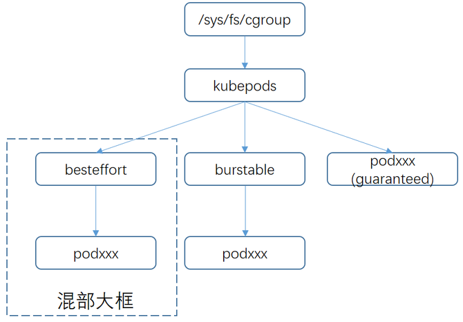 在前面的介绍中我们提到webhook会对混部任务申请的资源类型进行修改,去除原生的资源类型request.cpu和request.memory,改成caster.io/colocation-cpu和caster.io/colocation-memory。由于没有申请原生资源类型,那么k8s会自动将这类pod归类为best effort类型,并且最终通过runc将该类pod的cgroup设置到/sys/fs/cgroup/cpu/kubepods/besteffort目录,我们称为“混部大框”。