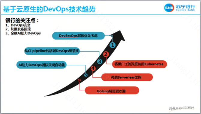 云原生技术已逐渐成为金融科技行业的技术标配,DevOps技术也已发展有十几年,两者的强强联手、有效结合必将是金融业数字化转型的利器和必经之路。基于 云原生 的 DevOps 全行业 技术趋势 预测为:DevSecOps将被优先考虑、将更广泛的深度使用Kubernetes、从CI pipeline转移到DevOps组装线、强调Serverless架构、AI助力DevOps团队实现自动化、Golang将更受欢迎。银行是非常重视安全合规的机构、金融互联网产品发布快且重视用户产品体验、在金融领域会全面使用金融AI技术,因此江苏苏宁银行会重点关注DevOps的安全、基于云原生的灰度发布回滚技术使用、金融AI助力DevOps等方面。