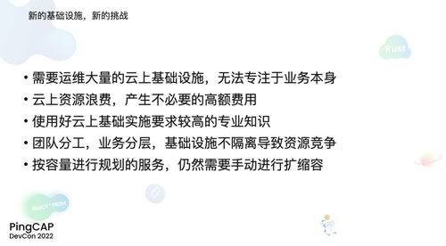 有了新的基础设施,当然也有新的挑战。云厂商给我们提供了许多的云服务,并且云的初衷之一,就是让使用者可以减少很多的运维工作。但是如果你现在深度地使用云,仍然需要运维大量的云上基础设施。这些运维工作使得我们开发者的精力被分散,没法完全专注于业务本身。除了运维工作之外,如何使用好云也是一门学问,前不久我刚刚参加了 AWS 的架构师培训,其实如何多快好省地用好云,不是一件简单的事儿。云服务的使用者,很容易就会造成云上资源的浪费,产生不必要的高额费用,特别是在现在许多的云服务,仍然是按时间来收费的情况下。对于有多套环境需求的场景,比如说公司内部有多个团队,不同的业务有各自的环境诉求,或者在 CICD 的场景下,我们可能会有 preview、stage、product 的多套环境需求,购买多套的云服务会产生高额的费用,但是共享一套云服务则可能会产生资源的竞争,甚至出现测试环境影响生产业务的情况。云上的服务,比如说云上的数据库服务,现在的使用方式仍然是提前规划容量,然后始终按照购买的时候的容量进行工作和计费,如果后期需要调整,仍然需要人工介入,手动去进行扩缩容。