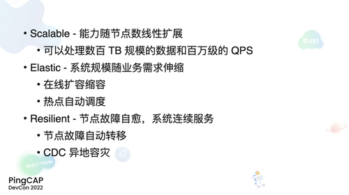 TiDB 已经在生产场景经历了数百 TB 规模的数据和百万级 QPS 的流量的考验。TiDB 还有着非常好的弹性,系统规模可以随着业务的需求进行伸缩。而且伸缩是完全在线进行的,不会影响已有的数据和请求。同时,对于系统中的热点,TiDB 也有能力自动发现,自动调度。TiDB 也有着非常好的容灾和高可用的能力,如果节点出现故障,上面的数据可以自动的进行转移,并且配合 PingCAP 推出的 TiCDC 工具,还能够做到实时的 CDC 同步,实现异地容灾。