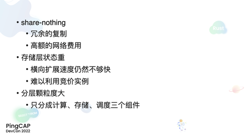但是这样的一个经典架构在云的时代,面对着完全不同的基础设施,存在一些问题。第一,share-nothing,刚才我们提到云厂商提供的基础设施,无论是块存储,还是对象存储,天然就有着高可用,高持久的特性,云厂商已经帮我们做了数据复制,但是 TiKV,TiDB 的存储层,仍然做的自己的数据复制。这在云上其实是多余的,数据的复制不仅仅是存储资源的浪费,同时还需要消耗大量的带宽,在云上,网络也是会造成非常高额的费用。第二,存储层状态重。这是因为每个存储节点,其实都存储着一些数据的副本,扩容转移一个故障节点都需要对这些副本进行同步,导致横向扩展的速度仍然不够快,也进一步导致难以利用云厂商提供的竞价实例,从而能够进一步的去降低成本。第三,TiDB 之前是一个非常经典的计算、存储、调度分离的架构。但是在云时代,这样划分的颗粒度仍然过大,每一个节点承担的责任过多,导致 TiDB 整体的弹性仍然不够,其实我们可以在云上,将更多的功能拆分出来形成单独的微服务,这些微服务可以独立的去进行扩容和部署,甚至这些微服务可以被多个集群去共享。如果拆分出更多的微服务,TiDB 集群整体的弹性会进一步上升。