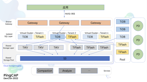 在计算层我们进一步地拆分了 TiFlash,TiFlash 现在它的计算存储已经可以去分离,TiFlash 的计算部分可以像 TiDB Server 一样,作为一个独立的组件去进行管理,去扩容。第二,我们引入了新的一层,叫做 Gateway。Gateway 代替了 TiDB Server 与用户去进行交互,它负责诸如连接管理、唤醒节点,这样的功能。它的出现使得我们所说的多租户成为一个可能。第三,我们池化了计算节点,在图上右边的部分,有多个 TiDB 和 TiFlash。我们将计算节点进行了池化,这样的设计进一步降低了计算层的成本,以及提升了计算节点唤醒的速度。计算层和存储层的改动,使得 TiDB Cloud Serverless Tier 支持了多租户。现在一套 TiDB Cloud Serverless Tier 集群,可以支持多个租户,每个租户都是完全隔离的。在用户看来,他们拥有的就是一套独立的 TiDB 集群。