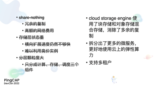 做完相应的改进,新的架构解决了之前所说的传统架构在云上的问题,更好地适应了云上的基础设施。这边总结一下,一是推出了 Cloud Storage Engine,可以融合地使用块存储和对象存储,并且消除了多余的复制,解决了两类问题,一是冗余的复制,二是高额的网络费用。第二,拆分出了更多的微服务,更好地使用了云上的弹性算力。整体的改动使得 TiDB Cloud 可以支持多租户。