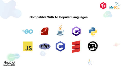 因为 TiDB 是 100% 兼容 MySQL 协议的,所以 TiDB 与所有的主流语言都是兼容的,比如 Go、Ruby、Java 、Python、JavaScript 等等,还有更多。TiDB 兼容的远远不只这些语言,这里列了一些比较流行的语言,只要一个语言拥有 MySQL driver,它就可以使用 TiDB,使用 TiDB Cloud Serverless Tier,不管这个语言多么小众。