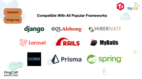 在语言之上,TiDB 还与基本上所有的流行的 ORM 框架兼容,与语言的 driver 不同,除了协议层的兼容之外,ORM 往往在功能上对 MySQL 的兼容性有着更高的要求,TiDB 的一些扩展能力也需要去进行补齐。TiDB 在这个方面做了很多努力,首先针对一些 ORM 开发了自己的插件,比如对于 django 和HIBERNATE,我们开发了django-tidb 和 hibernate-tidb 插件。TiDB 也在产品本身的 MySQL 兼容性的能力上做了很多增强,比如,可能在应用中我们可以不用,但是对于许多 ORM 框架都非常重要的两个功能 savepoint 和外键。这两个功能对于很多的 ORM 框架来说都非常重要,很多 ORM 框架对他的依赖都非常重。在最近两个 TiDB 的版本中发布了savepoint 功能和实验版本的外键功能,这使得 TiDB 进一步提升了与许多 ORM 框架的兼容性。