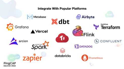 除了语言的 driver 和 ORM 框架之外,TiDB 以及 TiDB Cloud 还可以集成许多流行的平台,我们这里罗列了一些主要的,比如在数据处理领域,TiDB 可以与 Spark、Flink、Databricks 这些流行的大数据处理框架以及平台结合使用,来构建企业的 ETL pipeline,形成统一的数据处理平台。同时除了传统的 ELT 平台,TiDB 还可以与海外非常流行的 modern data stack 体系进行集成,我们给 Airbyte 贡献了 tidb-source-connector 和 tidb-destination-connector,开发了 dbt-tidb adapter,使得 TiDB、TiDB cloud 可以完美地与 Airbyte、dbt 进行集成。