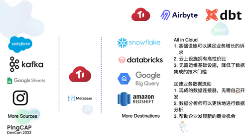总的来说,用户如果结合使用 TiDB Cloud、Airbyte 和 dbt 建立一条 ELT data pipeline,一是可以使自己的数据设施 all in Cloud,整条流水线都可以拥有非常好的弹性,可以满足业务增长的诉求。同时云上的基础设施拥有很高的性价比,可以降低数据基础设施的成本,而且因为 all in Cloud,你无需运维,降低了数据集成的技术、费用门槛。二是可以加速企业内业务数据的流动,Airbyte 拥有上百种的数据连接器,用户可以直接去使用,无需自己设计、开发,从而企业内的数据分析师可以更快地进行数据分析,帮助企业发现新的商业机会,而不是把精力浪费在基础设施的重复建设当中。