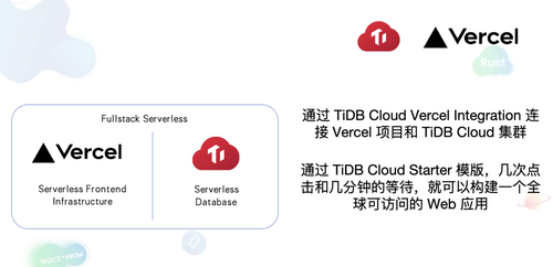 Vercel 本身作为一个 Serverless Frontend Infrastructure,它不具备持久化数据存储的能力,这也就意味着如果仅仅使用 Vercel 的能力,没办法去开发一个复杂的 web 应用。所以我们可以结合 Vercel 和TiDB Cloud Serverless Tier,从而获得一套完整的 web 开发的 Fullstack Serverless Infrastructure,和前面的 all in Cloud 的 data pipeline 一样,这套 Web App Develop Infrastructure 也是 all in Cloud,用户无需运维,基础设施可以自动扩展,并且具有很高的性价比。