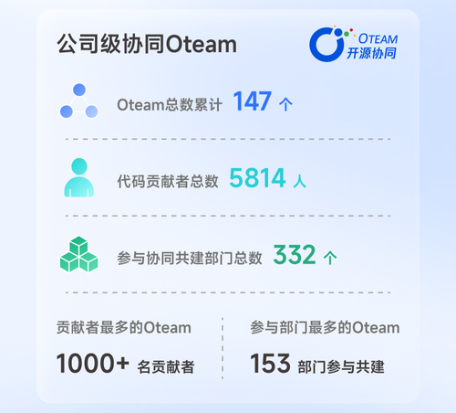 《报告》显示,腾讯内部代码仓库开源率已连续四年保持在80%以上。公司级协同Oteam(开源协同小组简称)总数累计达到147个,涵盖了大数据、数据库、AI、研效、安全等数十个领域。代码贡献者总数达到5814人,参与协同共建的部门总数达到332个。