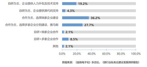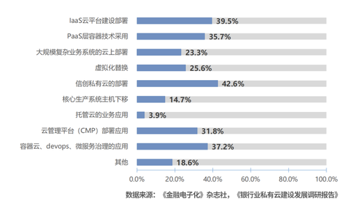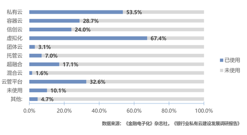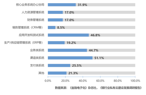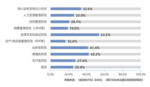 中国银行业私有云主要用于应用开发测试、渠道类系统和业务类系统。从被调研银行业金融机构数据来看,应用开发和测试系统占比最高,达到53.5%(见图2)。