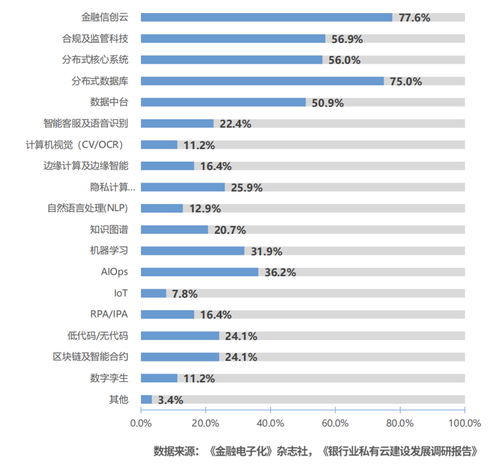 信创云建设是银行业基础设施当前及未来关注的焦点之一。在云计算建设方面,信创云关注度排名领先;在关注“金融科技新技术发展趋势”中“信创云”占比77.6%(见图3)。