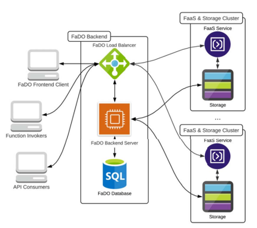 同样考虑到数据分布的问题,即数据可能分布在不同的区域,而且由于数据隐私性、传输开销等问题,并不能方便地集中在一个区域内处理,中的作者设计了 FaDO 系统用以编排 Serverless 计算任务和数据。如图1所示,FaDO 通过 Backend Server 记录每个区域存储的数据,这些信息则被提供给 Load Balancer 用于将用户请求的计算任务匹配并发送到对应的区域。并且在规则允许范围内, Backend Server 还会将数据备份在不同的区域间进行复制,以配合计算任务的并发度。